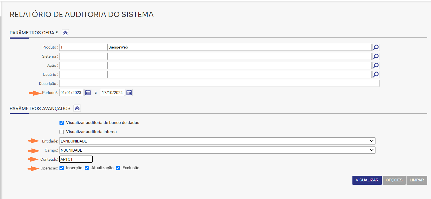 Para verificar as movimentações feitas no cadastro da unidade, seguir em Segurança / Administração / Auditoria do Sistema, preencher os campos indicados abaixo: