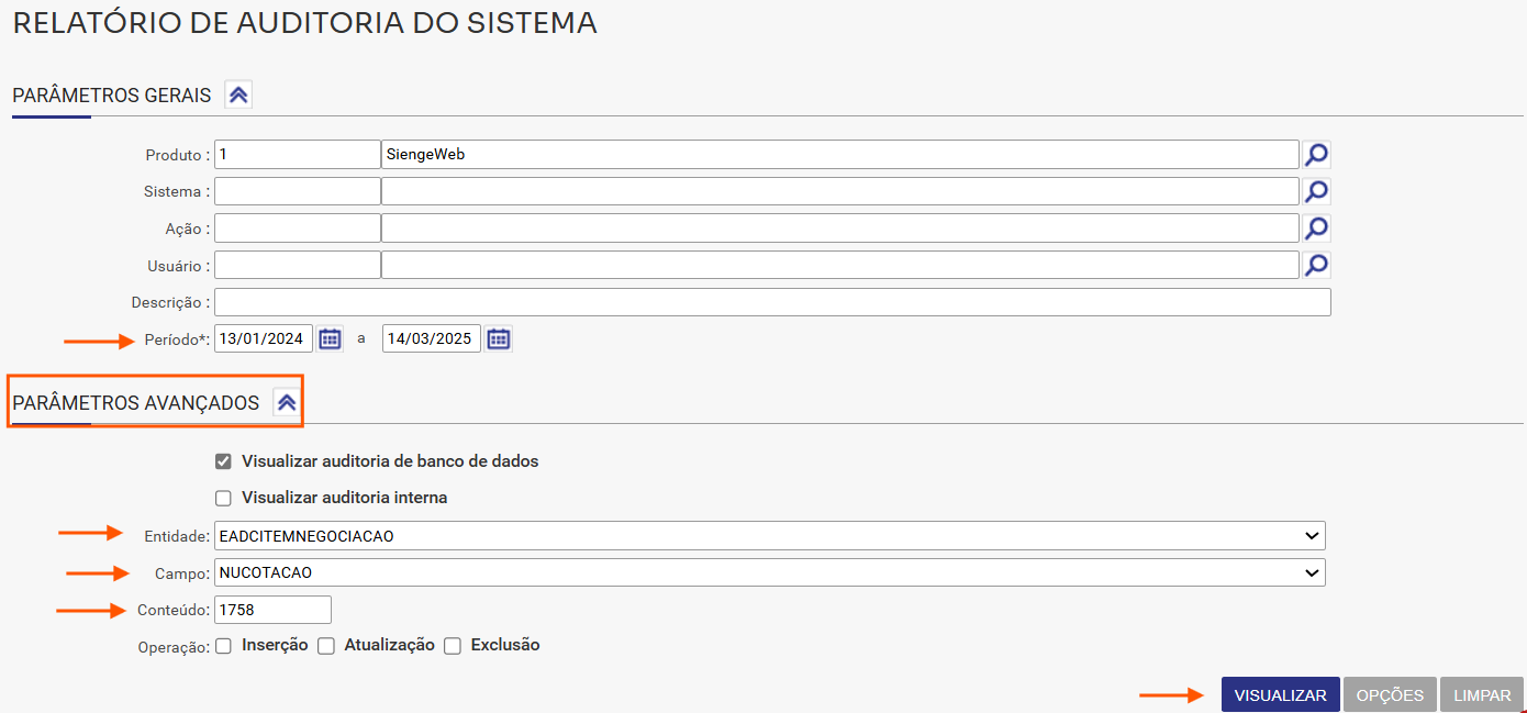 • Período*: Informe a data de início e término de emissão dos dados da auditoria.