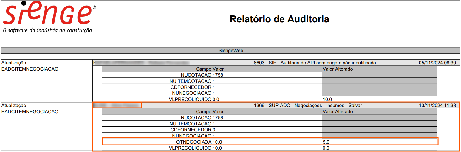 Em alguns momentos faz-se necessário identificar qual usuário realizou a alteração na quantidade negociada de um insumo. Como essa informação não aparece nos relatórios de Engenharia e Suprimentos, somente é possível determinar esta alteração via Auditoria do Sistema.