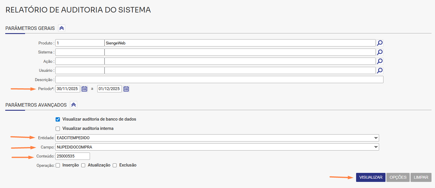 - Período*: Informe a data de início e término de emissão dos dados da auditoria.