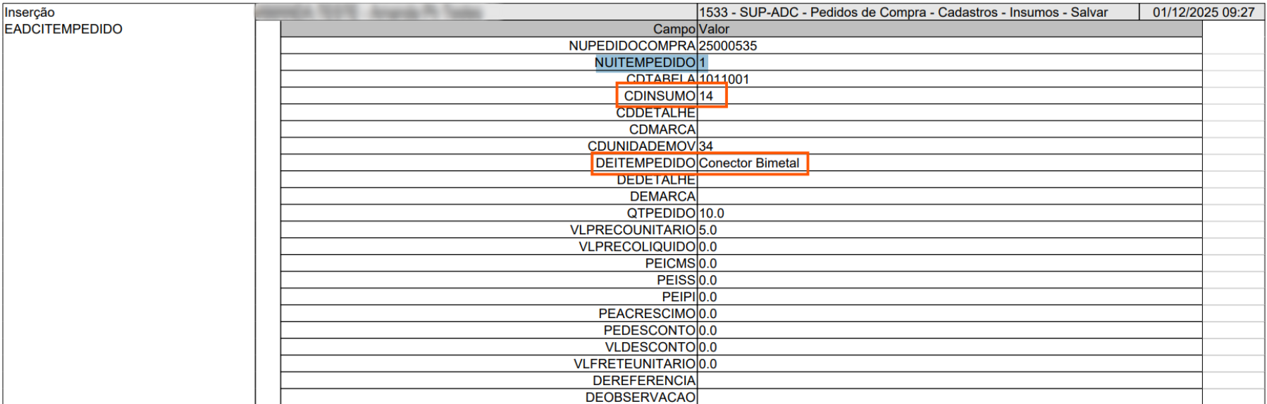 3. Note que no exemplo acima, o preço unitário do insumo (item 1 do pedido) foi alterado de 5.0 para 6.0 no dia 01/12/2025 às 10:48 por um determinado usuário.