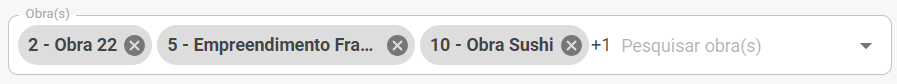 2) Obra(s): Permite selecionar uma ou mais obras para filtrar por contratos que possuam essa obra específica. Apresentará apenas obras que o usuário possua as devidas permissões em Contratos.