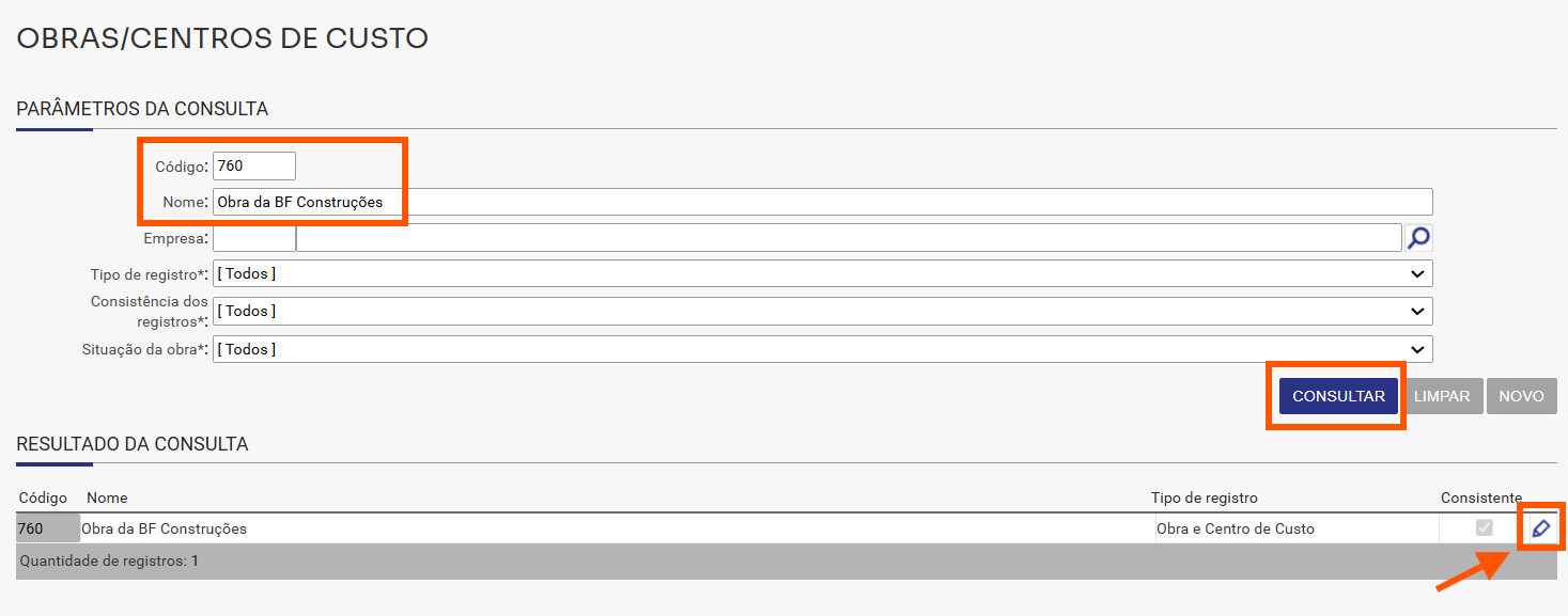 2. Buscar o cadastro da obra pelo código e/ou nome, para abrir o cadastro deverá clicar no ícone do lápis: