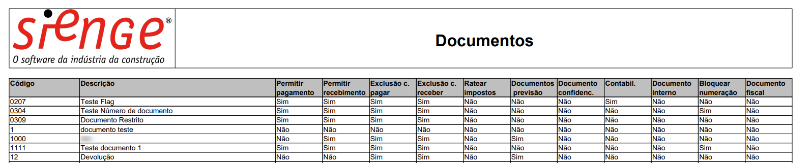 - Assim será apresentado o relatório com as informações principais de cadastro dos documentos: