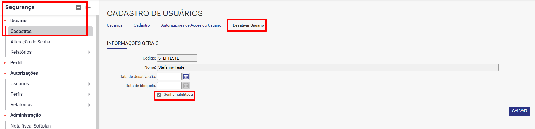 Além disso, o usuário que vai ter sua senha alterada, precisa estar com o cadastro ativo e senha habilitada, também pode verificar em Segurança / Usuário / Cadastros. Na aba "desativar usuário" as informações devem estar em branco e a flag de "Senha Habilitada" marcada: