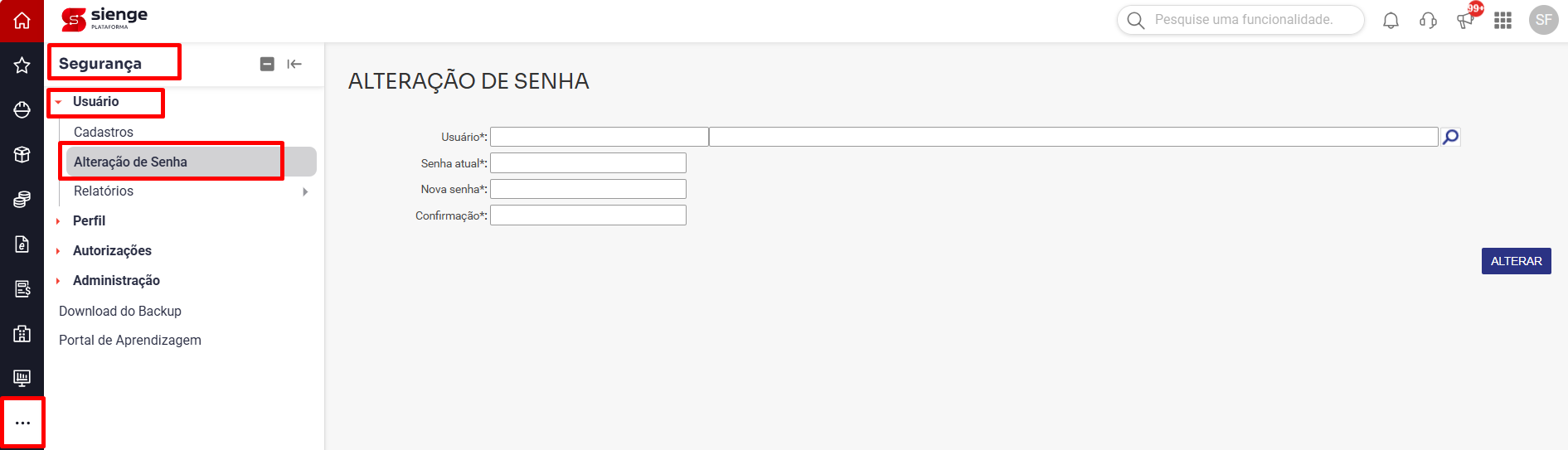 - Para realizar a alteração de senha, o usuário administrador do seu sistema deve acessar o caminho: Segurança / Usuário / Alteração de Senha