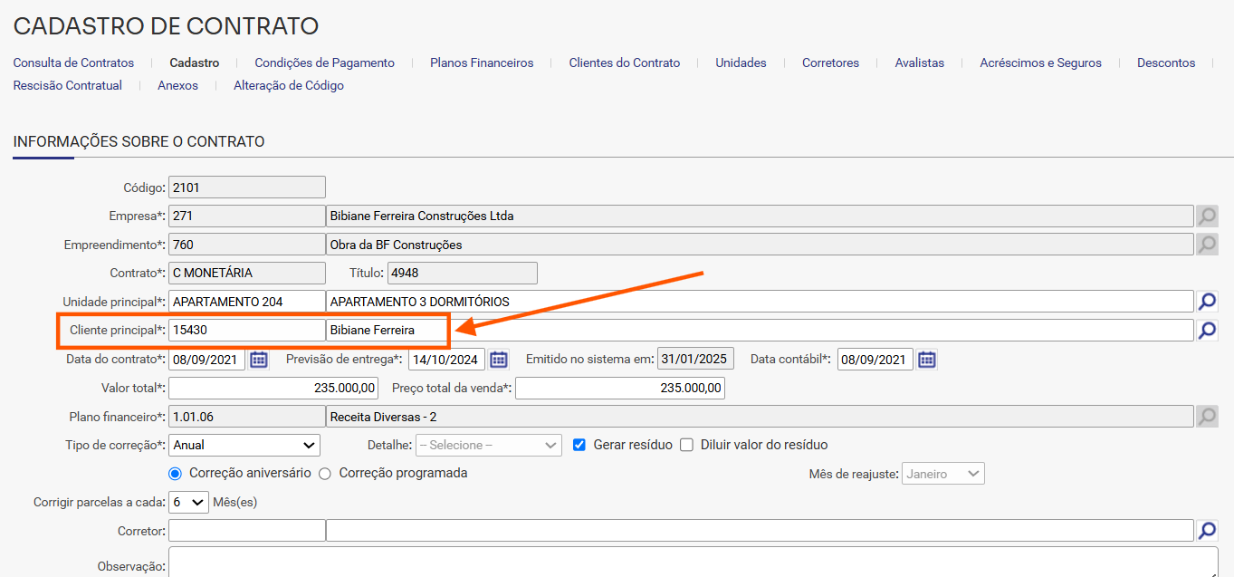 7. Ao refazer a consulta do contrato, podemos ver que o nome do cliente foi atualizado: