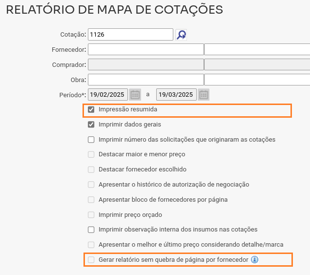 Os pré requisitos para emissão do Relatório Mapa de Cotação seguem o comportamento padrão do Sienge. São eles: