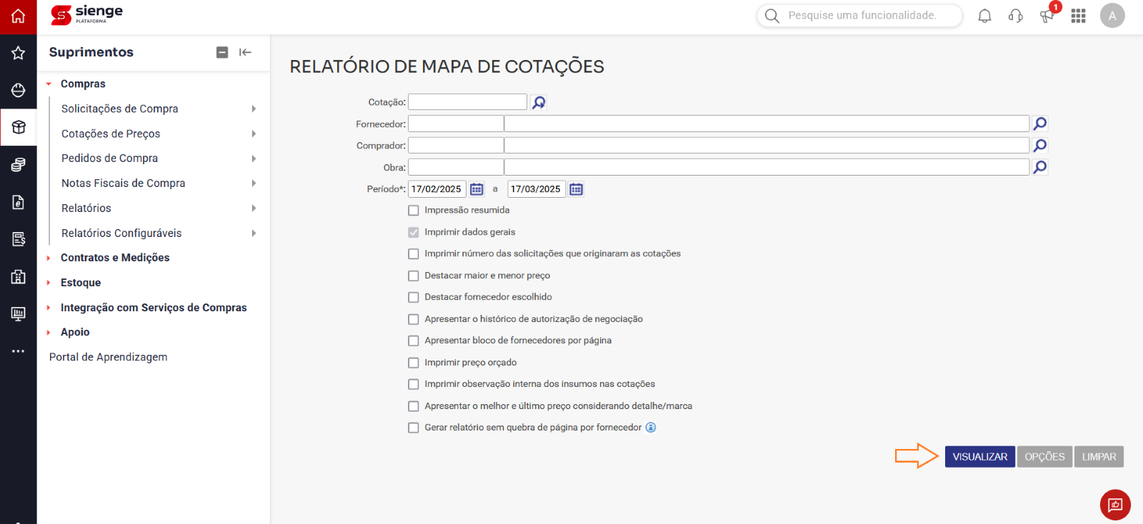 1) Acesse o menu Suprimentos > Compras > Relatórios > Cotações de Preço > Mapa de Cotações.