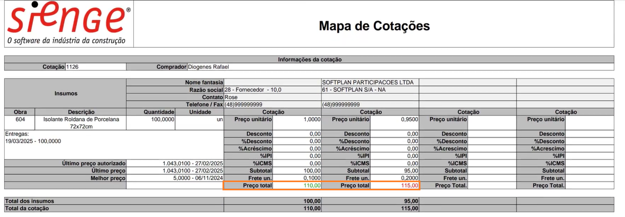 3) O relatório será exibido em colunas, destacando a cotação, os insumos, os fornecedores e os valores cotados.