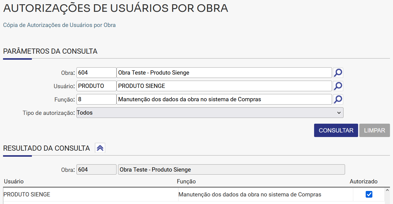 Somente serão apresentadas solicitações de compra consistentes e nas quais o usuário possui acesso na obra. A autorização de obra para visualização da solicitação de compra é a permissão 8. Manutenção dos dados da obra no Sistema de Compras, podendo ser liberado acesso no menu Segurança > Autorizações > Usuários > Obras.