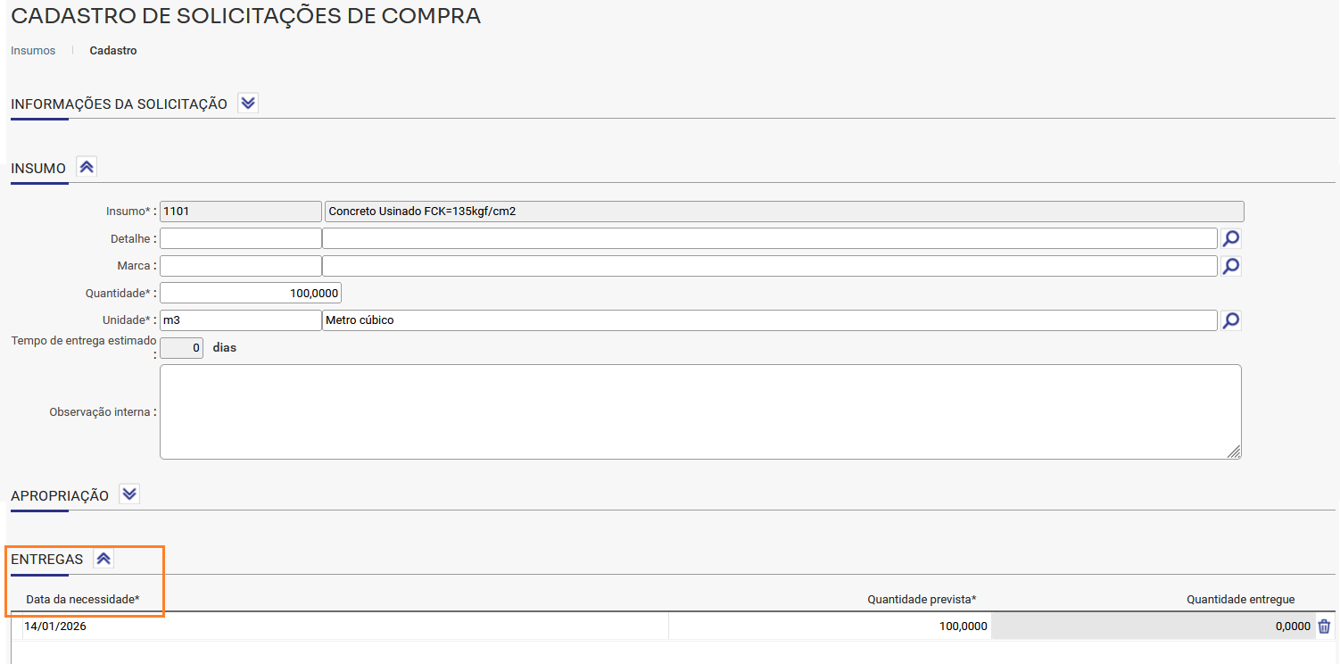- Previsão de Entrega: Data estimada para entrega do insumo na obra.