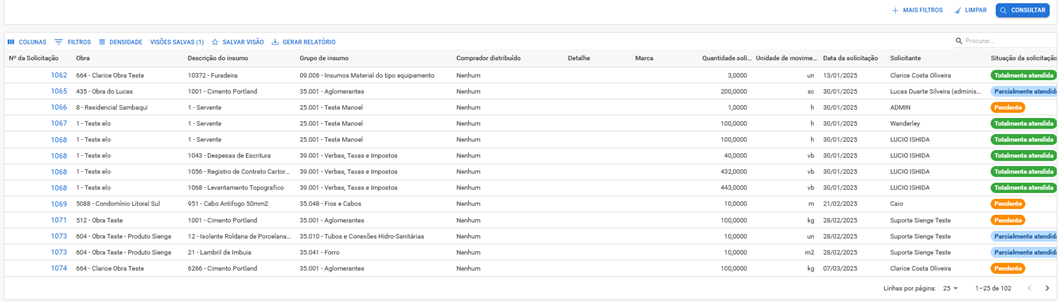 - Situação da Solicitação: Situação atual da solicitação (Pendente, Parcialmente atendida, Totalmente atendida ou Cancelada).