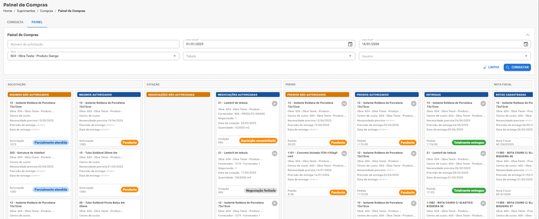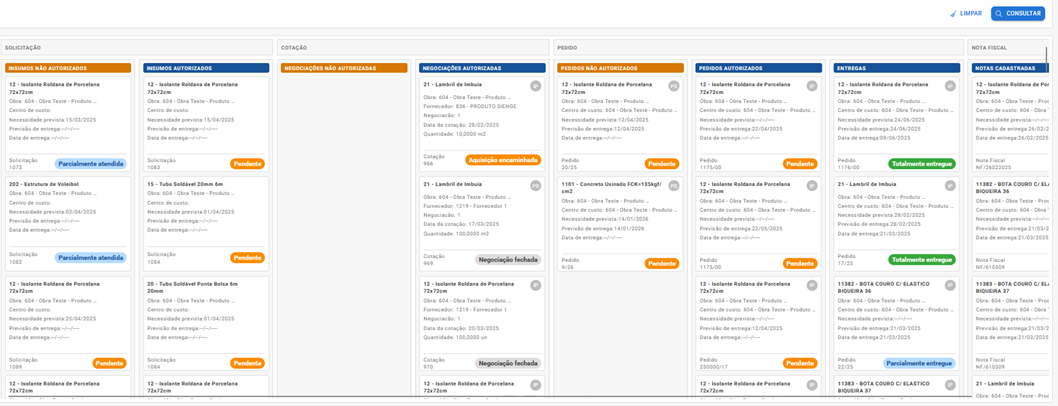 - Visualização consolidada das etapas da compra, com filtros dinâmicos por obra, fornecedor, insumo, entre outros;