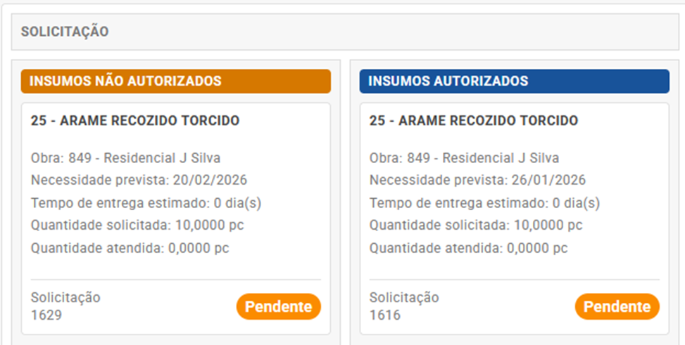 - Previsão de Entrega: Data estimada para entrega do insumo na obra.