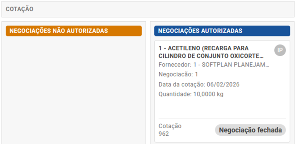 - Negociações autorizadas: Apresenta as negociações que estão aprovadas e podem gerar pedidos de compra.