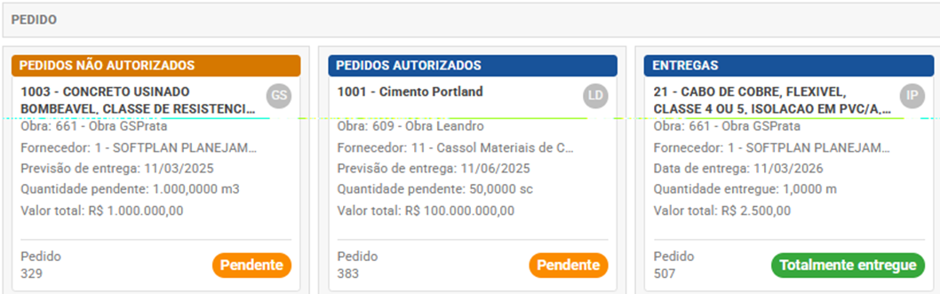 - Pedidos não autorizados: Apresenta os pedidos de compra que estão aguardando autorização.