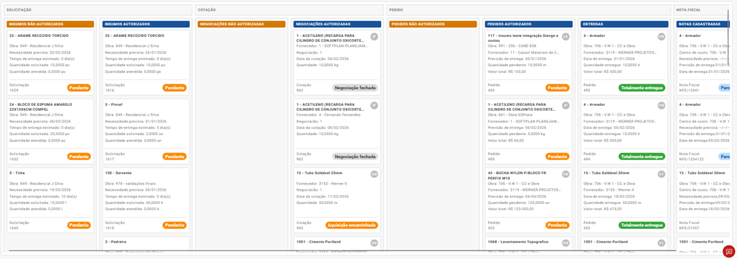 Organizados em cards, os insumos são apresentados de acordo com cada etapa do fluxo: solicitação, cotação, pedido e nota fiscal. Essa estrutura destaca pontos críticos, como pendências de aprovação, e fornece informações relevantes específicas para cada fase.