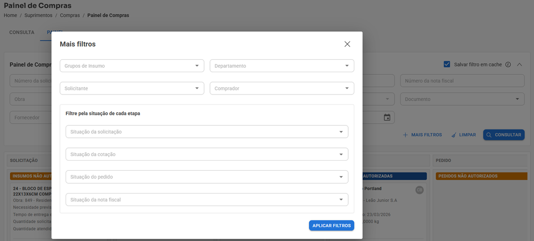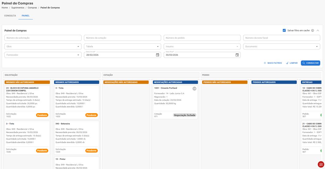 - Visualização consolidada das etapas da compra, com filtros dinâmicos por obra, fornecedor, insumo, entre outros;