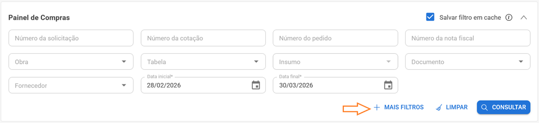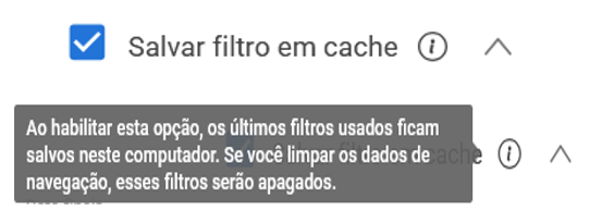 - Botão Salvar Cache: O botão ‘’Salvar filtro em cache’’ permite ao usuário escolher se deseja salvar os filtros utilizados, possibilitando que eles sejam reaplicados automaticamente em consultas futuras.