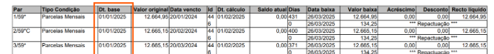 Dica! Outra forma de verificar a data base das parcelas é emitindo o relatório Extrato do cliente. Para isso você vai acessar Financeiro / Contas a Receber / Relatórios / Extratos / Extrato de Cliente e verificar a coluna "Dt. base".