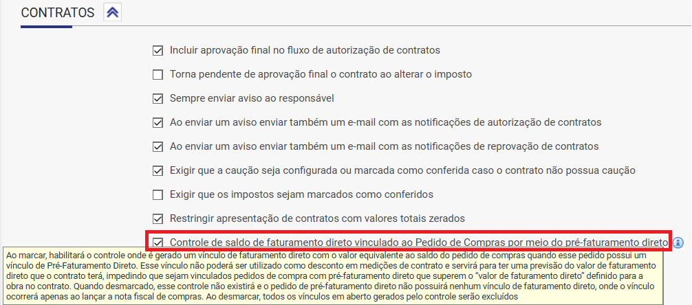 Quando a parametrização está desativada, a criação de Pedidos de Compra de Pré-Faturamento Direto não gera nenhum tipo de vínculo com os valores de faturamento direto do contrato. Isso possibilita que, por exemplo, um pedido de compra de R$ 10.000,00 seja vinculado a um contrato que possui apenas R$ 5.000,00 de faturamento direto estipulado, onde apenas quando a nota fiscal de compras for lançada é que o sistema criará o vínculo e então validará que o valor da nota é superior ao valor estipulado de faturamento direto, possibilitando o vínculo de apenas R$ 5.000,00.