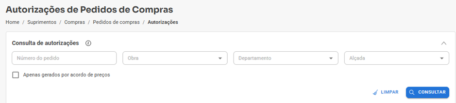 Nota! Caso a configuração “Restringir apresentação de pedidos não autorizados conforme definição das alçadas” esteja habilitada, em Suprimentos / Apoio / Configurações de Autorização, o filtro de alçadas não trará efeitos na consulta, a qual retornará apenas pedidos da alçada específica do usuário.
