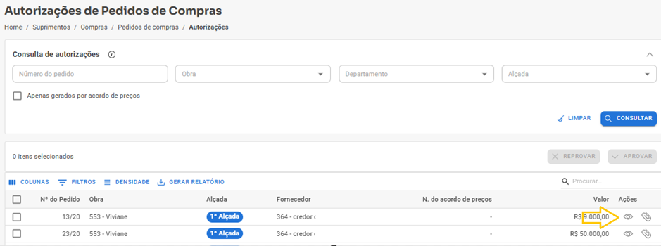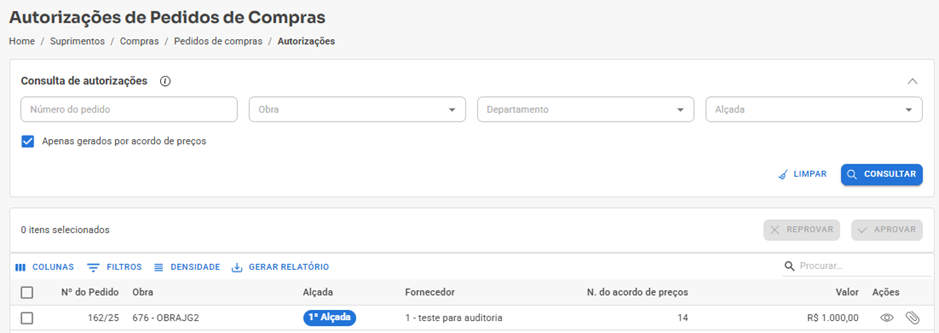 Atenção! Caso o usuário não possua acesso para aprovar um pedido que está sendo listado, também não conseguirá reprová-lo.