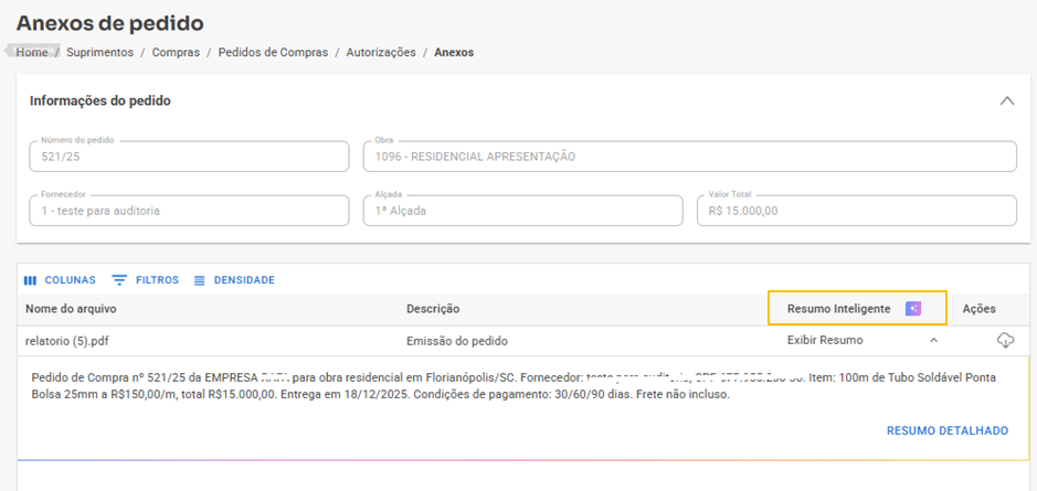 Dica! A tela de anexos acessada, contempla também a funcionalidade de Resumo inteligente, conforme exemplo abaixo. A qual exibe o resumo do arquivo anexado, sem ser necessário download.