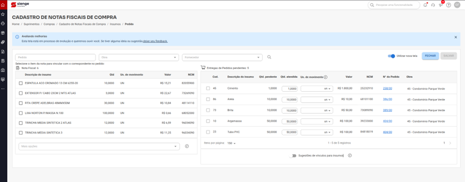 O vínculo entre o item do pedido de compra e o item da nota fiscal eletrônica (NF-e) é um dos controles mais importantes do Sienge. Essa funcionalidade garante que cada etapa do processo de compras seja acompanhada com segurança, desde o recebimento do material até o pagamento ao fornecedor e a escrituração fiscal.