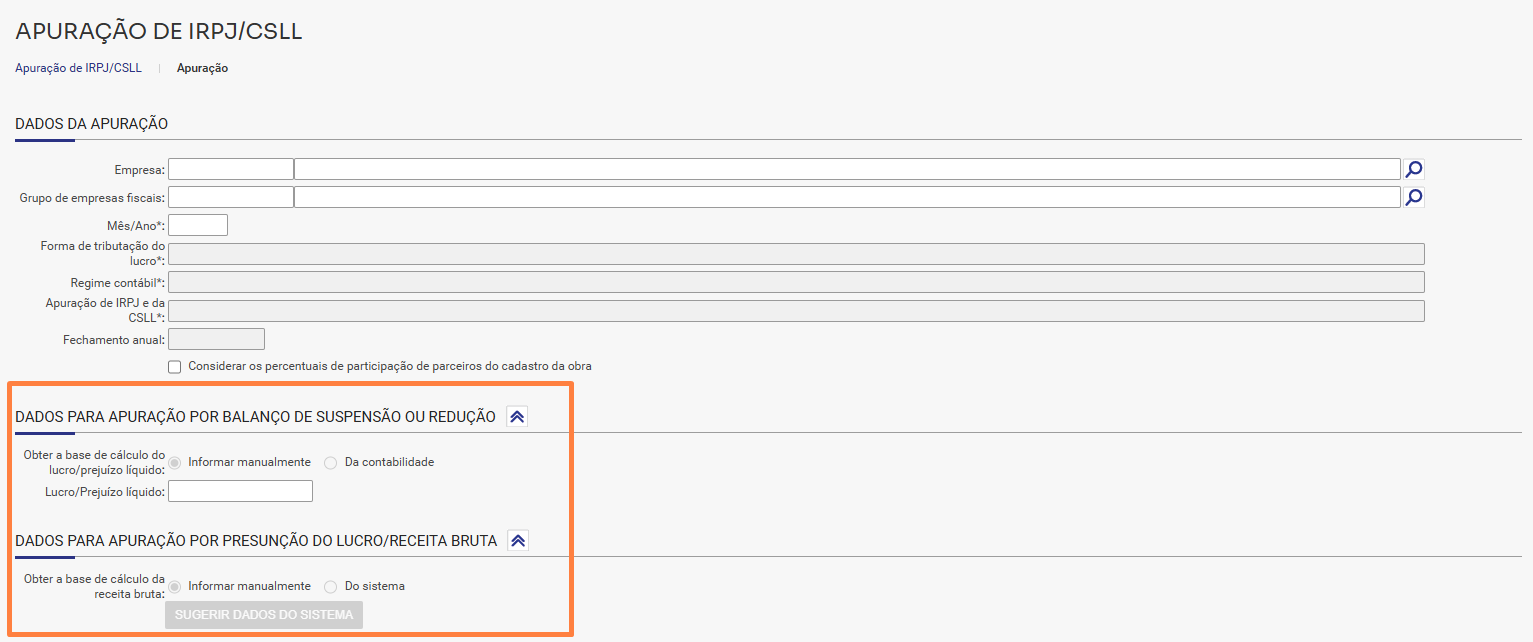 - Apuração de IRPJ e da CSLL*:Campo já virá preenchido de acordo com a configuração anual fiscal