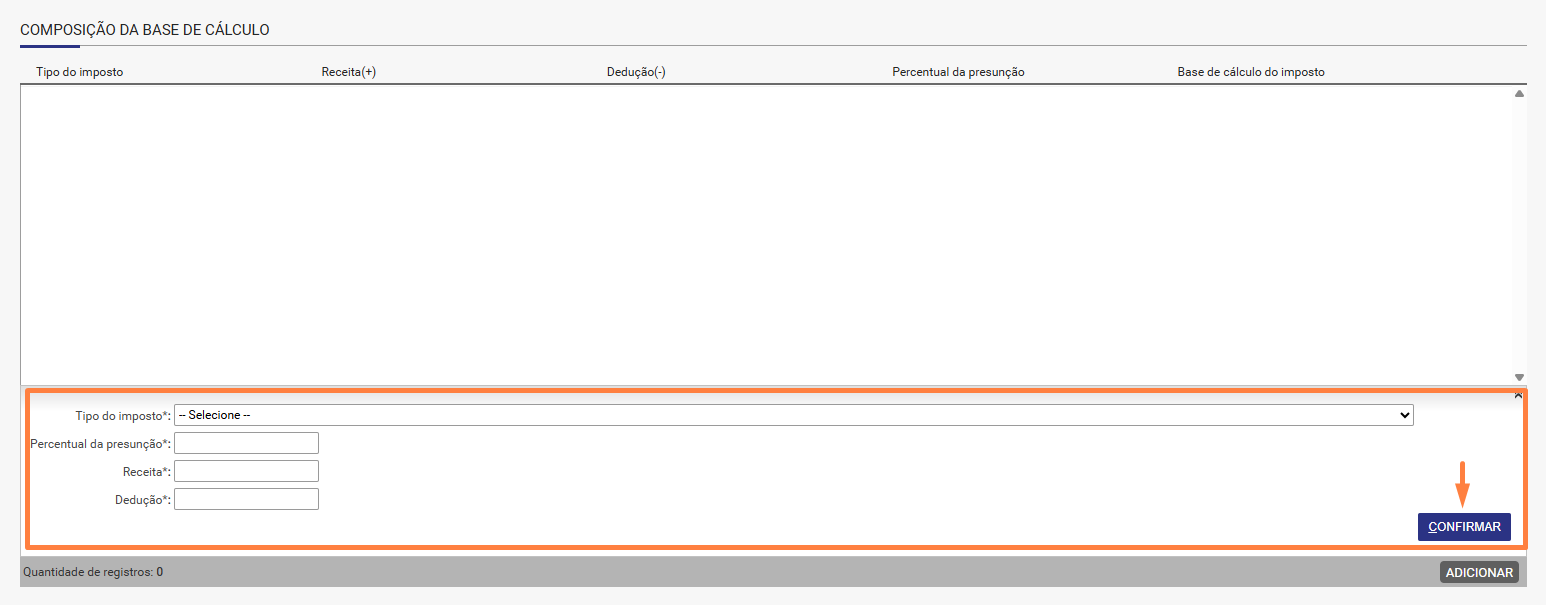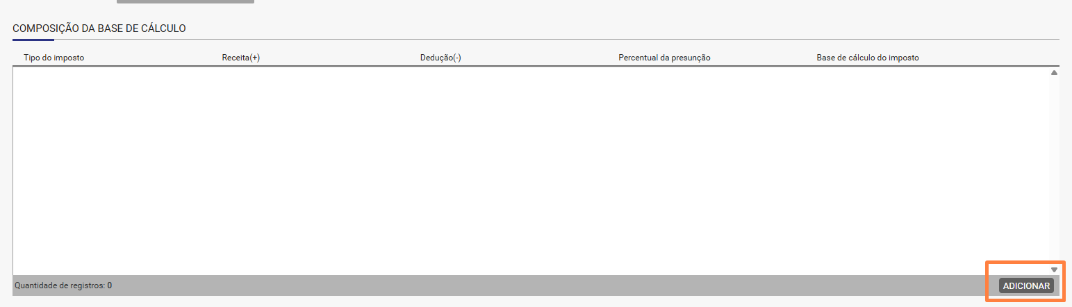 Usuário deverá clicar em adicionar para abrir a tela de inserção das informações do imposto.