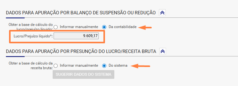Ao selecionar as opções "Da contabilidade" nos dados para apuração o sistema já busca a informação do lucro/prejuízo liquido do sistema de Contabilidade e selecionando a opção "Do sistema" os dados serão apurados conforme os registros cadastrados no sistema Financeiro que tê as informações fiscais completas.