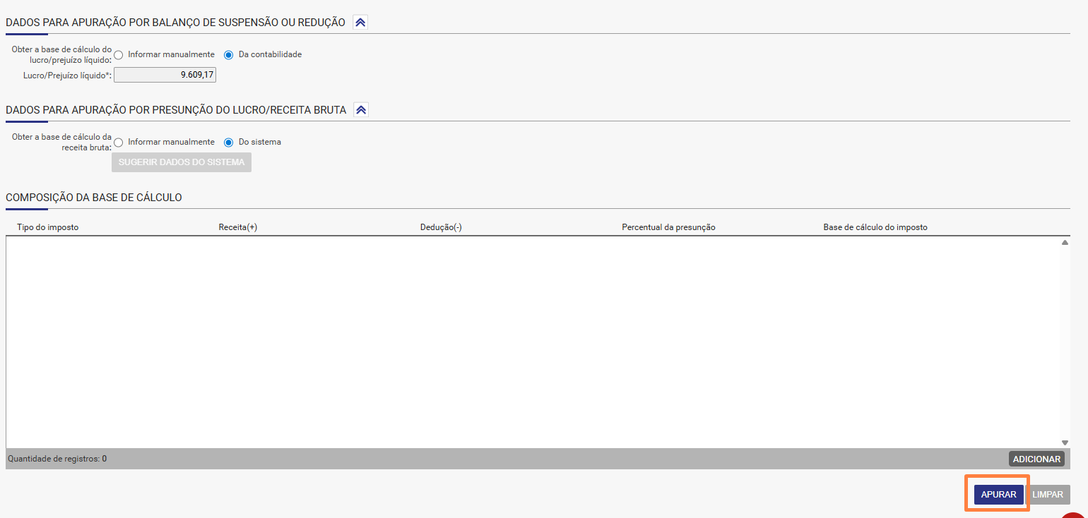 A apuração pode ser feita de duas formas, manualmente ou com os dados do sistema.