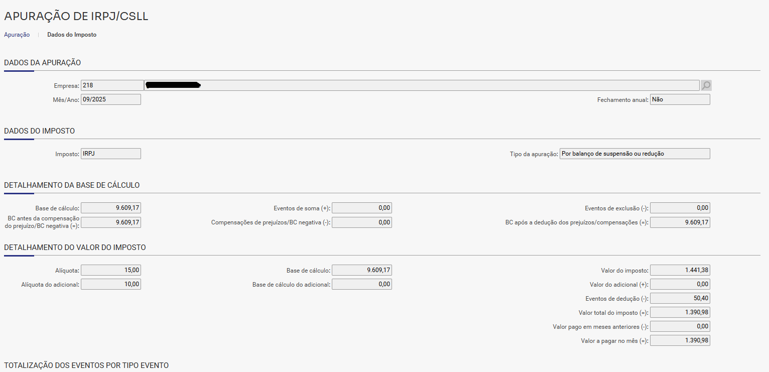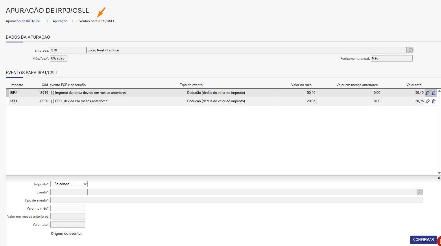 Na aba eventos para IRPJ/CSLL terá a opção de incluir deduções ou adições aos impostos.