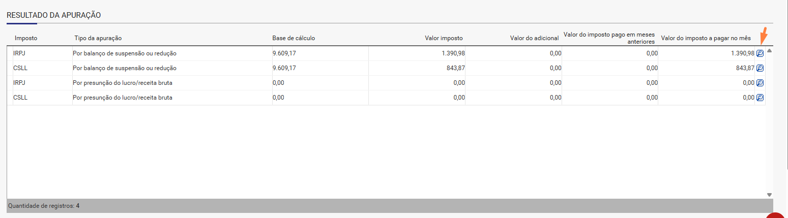 Após clicar em apurar serão apresentadas as informações dos impostos. Clicando na lupa, terá a informação mais completa do cálculo do imposto selecionado.