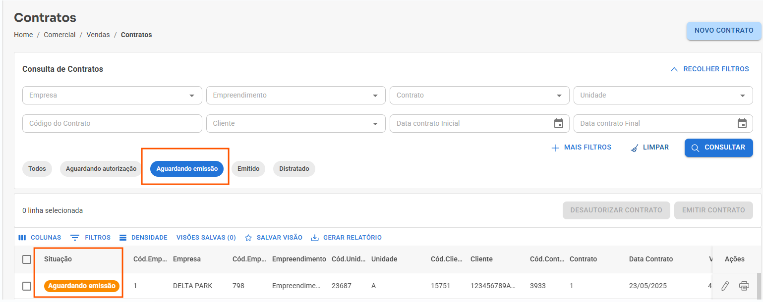 2. Para localizar esta reserva no Sienge acesse Comercial/Vendas/Contratos/Contratos, ir na Aba Aguardando Emissão, pois este contrato já estará autorizado, exemplo: