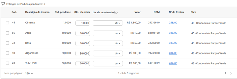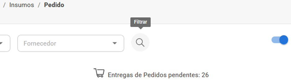 - Quantidade pendente: Campo não editável. Apresenta a quantidade disponível para entrega do insumo.