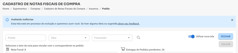Foi adicionada uma mensagem informativa na tela de vínculo do pedido com a nota fiscal eletrônica (NF-e). Esse aviso tem como objetivo comunicar ao usuário que a funcionalidade está em processo de evolução e que sugestões ou ideias podem ser enviadas diretamente pelo link disponível na própria interface.