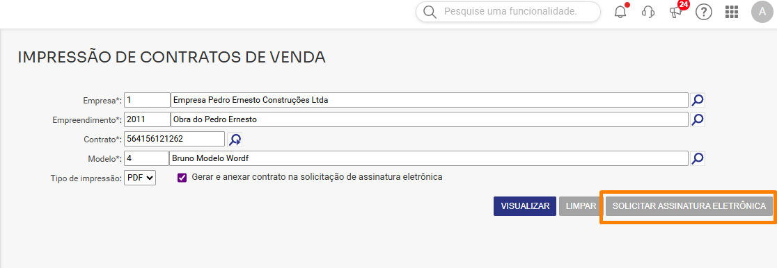 2. Em  Comercial/Vendas/Relatórios/Impressão de contratos, para fazer a solicitação da assinatura eletrônica de contratos de vendas é preciso preencher os filtros e clicar em "Solicitar assinatura eletrônica":