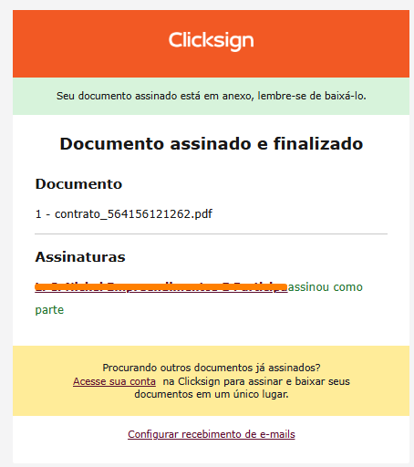 3. Após todos os participantes efetuarem a assinatura, irão receber um e-mail de confirmação com o aviso que o documento foi assinado e finalizado:
