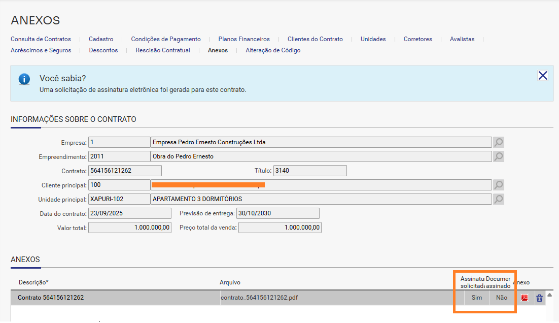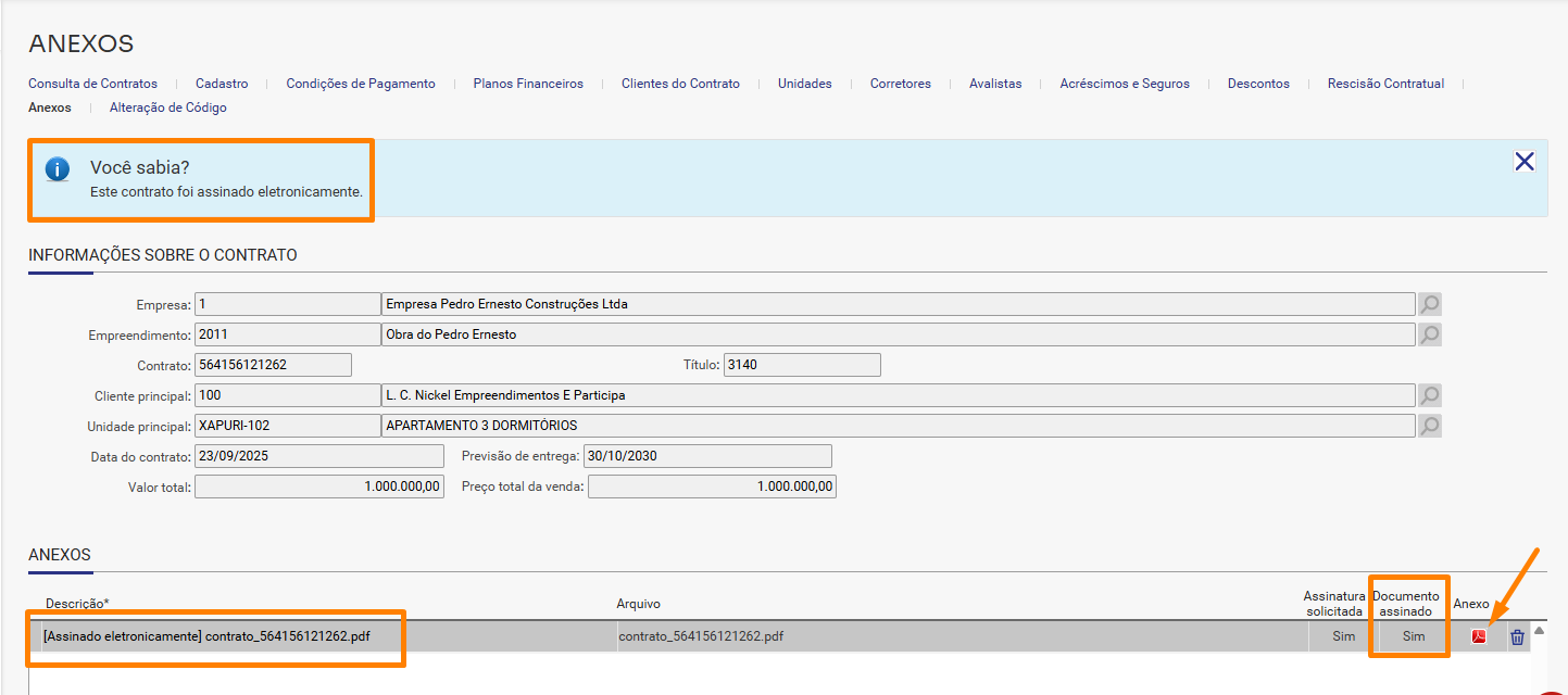 4. Agora no contrato de venda na aba de anexos, terá a informação que este contrato foi assinado eletronicamente.