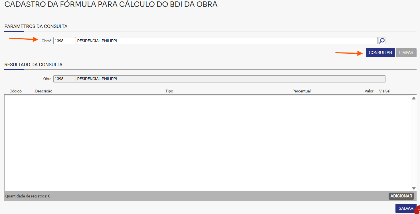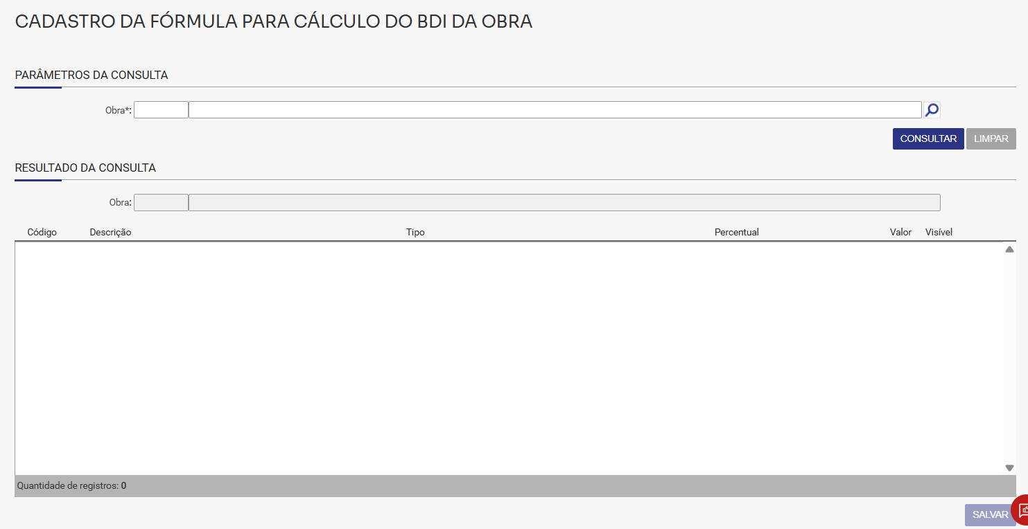 6. Insira o cálculo de BDI da sua obra, utilizando os tipos citados acima conforme desejar, e clique em SALVAR para concluir e registrar a fórmula. A seguir, abordaremos um exemplo para facilitar a compreensão de como utilizar essa ferramenta.