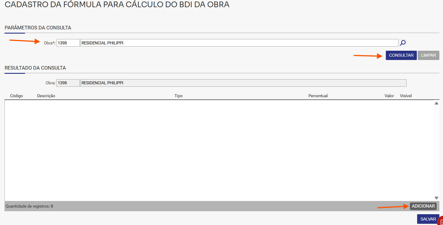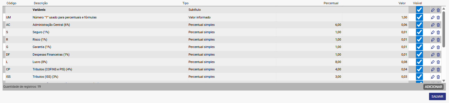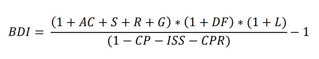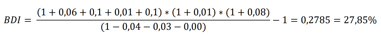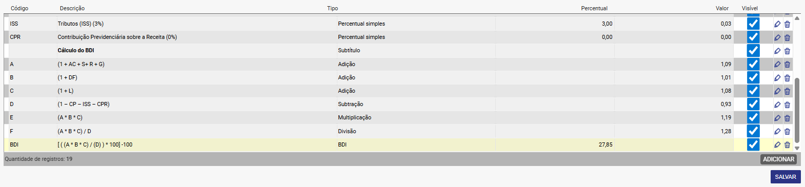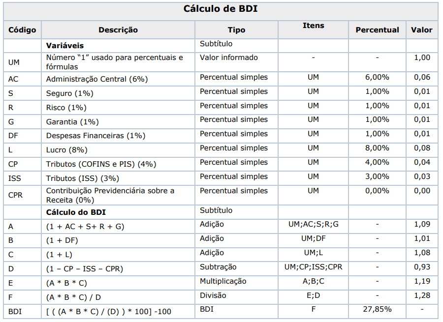 - BDI: determina o final do cálculo e o seu resultado será utilizado como o BDI da obra. O cálculo realizado no tipo BDI é: