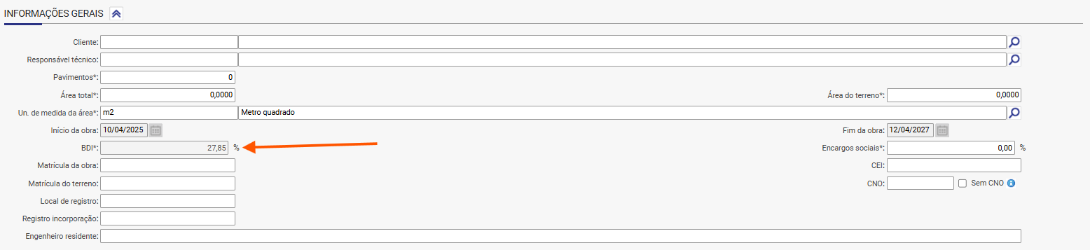 Nota! Ao utilizar a ferramenta e definir uma fórmula de calculo de BDI para uma determinada obra, o campo BDI localizado nas informações gerais da obra, em Apoio > Obras/Centros de Custos > Cadastros > aba Obra, ficará bloqueado para alteração, considerando o valor calculado.