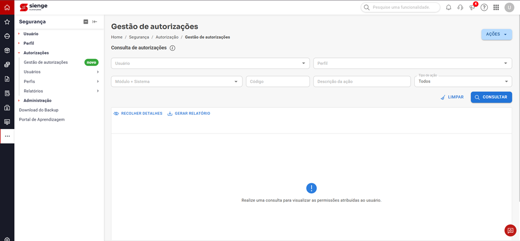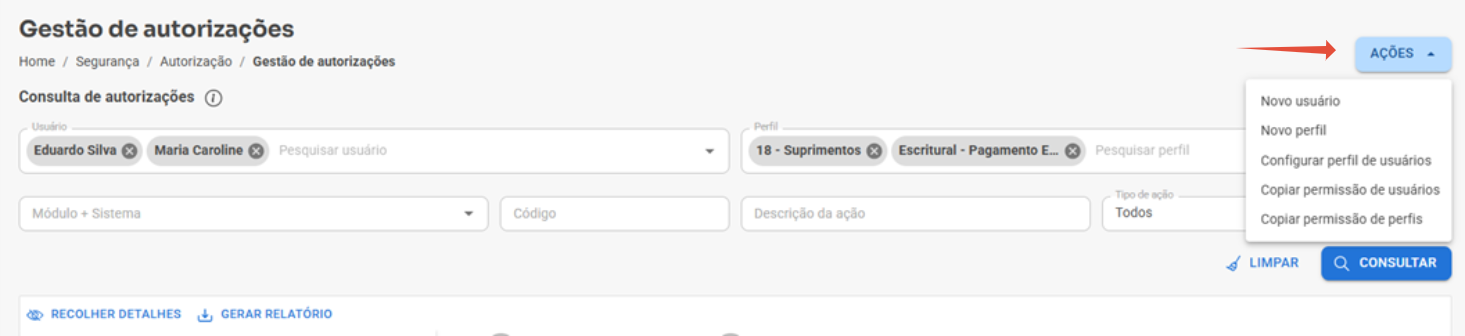 - Filtros adicionais: código da autorização, descrição da ação ou tipo.