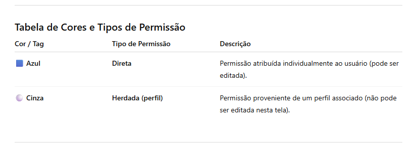 As tags de cor facilitam a identificação rápida da origem de cada permissão exibida na matriz. Elas ajudam a diferenciar se uma autorização foi atribuída diretamente ao usuário, herdada por um perfil ou modificada manualmente.