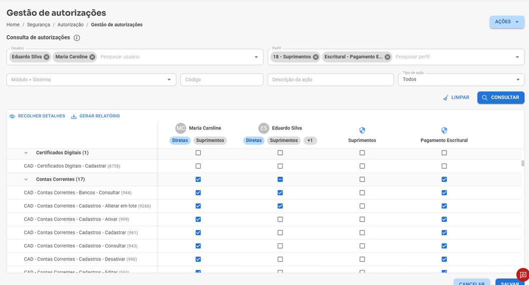 A nova tela de Gestão de Autorizações foi desenvolvida para tornar o gerenciamento de permissões mais simples, rápido e centralizado. Agora, você pode comparar, editar e salvar autorizações de usuários e perfis em um único lugar — sem necessidade de alternar entre várias telas ou processos.
