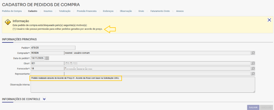 Ao consultar um pedido de compra gerado automaticamente a partir de um Acordo de Preço, o sistema exibirá uma sinalização informando que o pedido não pode ser editado.
