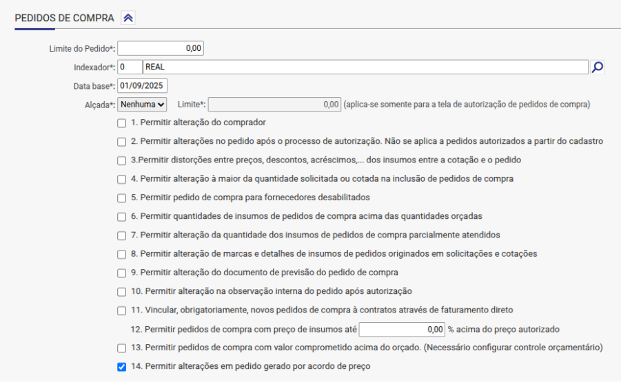3) No item Pedidos de Compra, marque a autorização 14 - Permitir alterações em pedido gerado por acordo de preço;